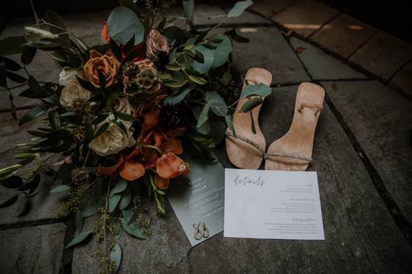 Flat lay pictures or detail pictures are very common and a beautiful way to combine the florals and colors that are highlighted throughout the wedding into one snapshot of the day.  The important details like invitation, rings, shoes, wedding colors are all brought together with floral accents.